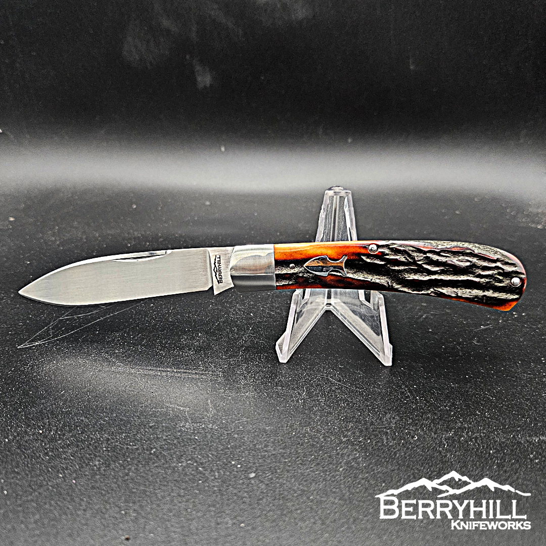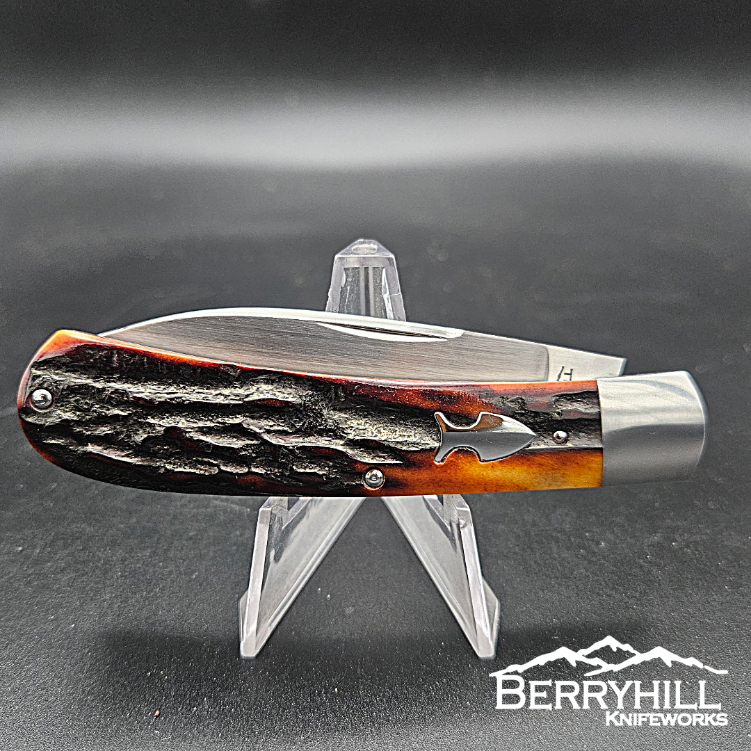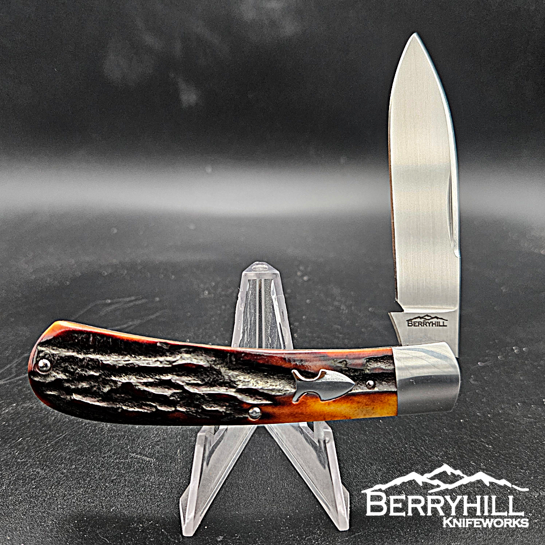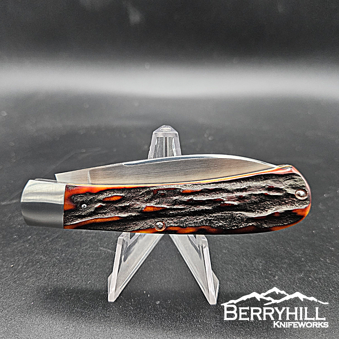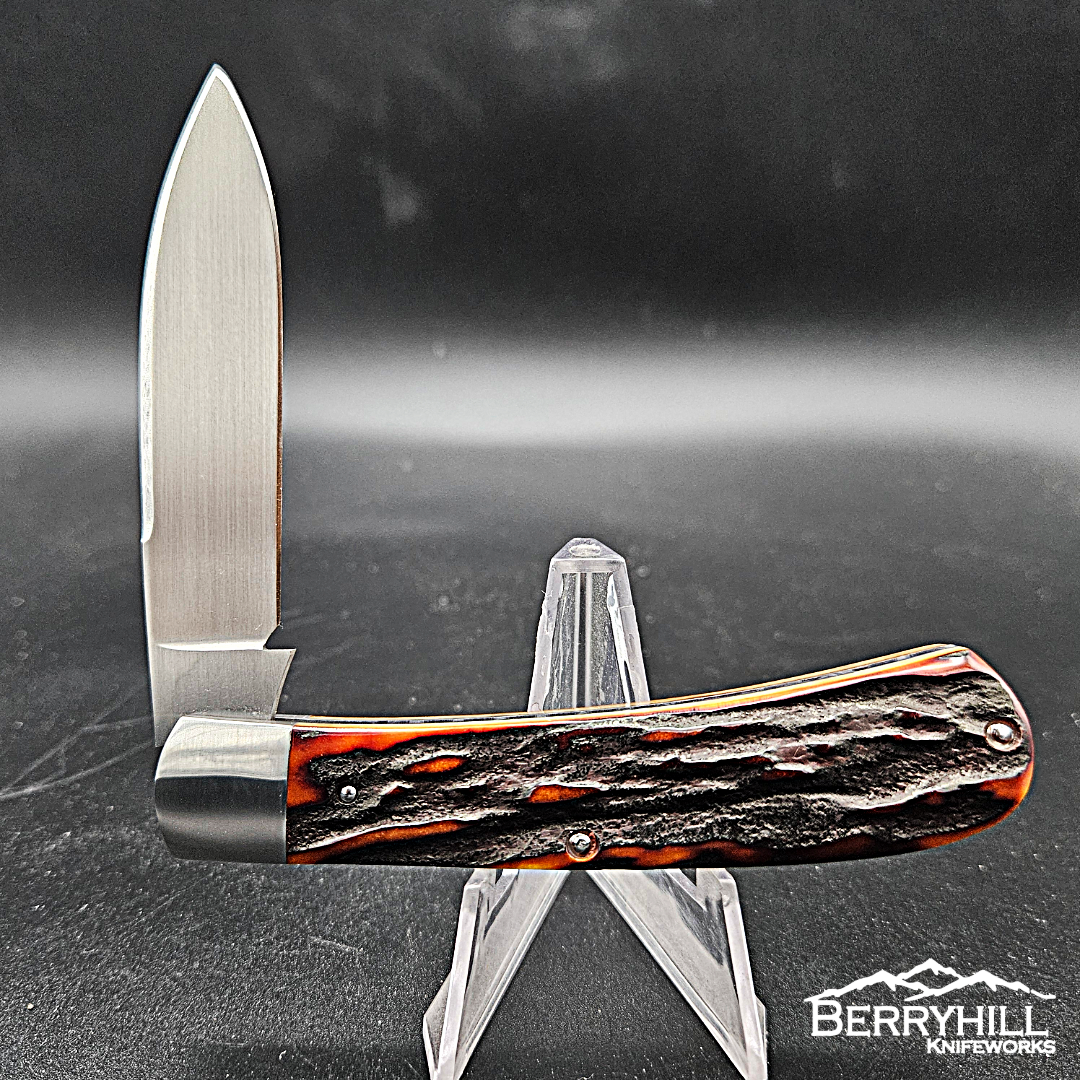 Full size Zulu. 4 inches closed. CPM-154 Blade and spring. 416 stainless steel bolsters with integral liners. Amber stag covers.